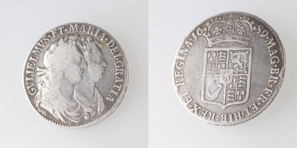 Lot 304 A William and Mary Halfcrown dated 1689, second reverse, PRIMO caul and interior frosted with pearls F S.3435 ( polished ) £50-70