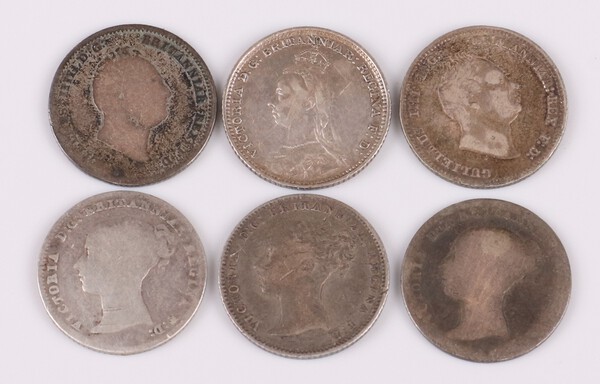 Lot 306 Six GB Queen Victoria sterling silver four pence coins, various dates. Grade F-VF. S.2913 £30-50