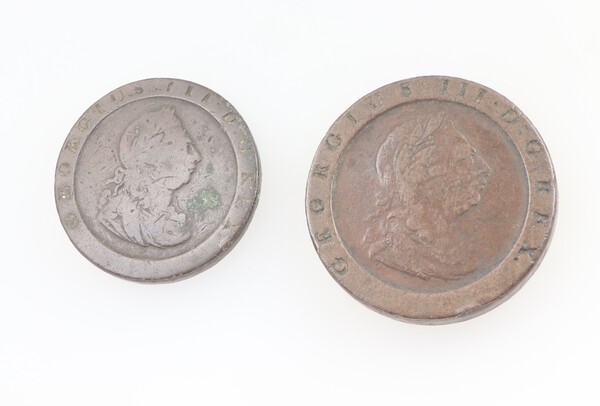 Lot 307 George III, two solid copper coins dated 1797, twopence (S3776) and penny (S3777), Birmingham cartwheel coinage (Soho mint) £50-75