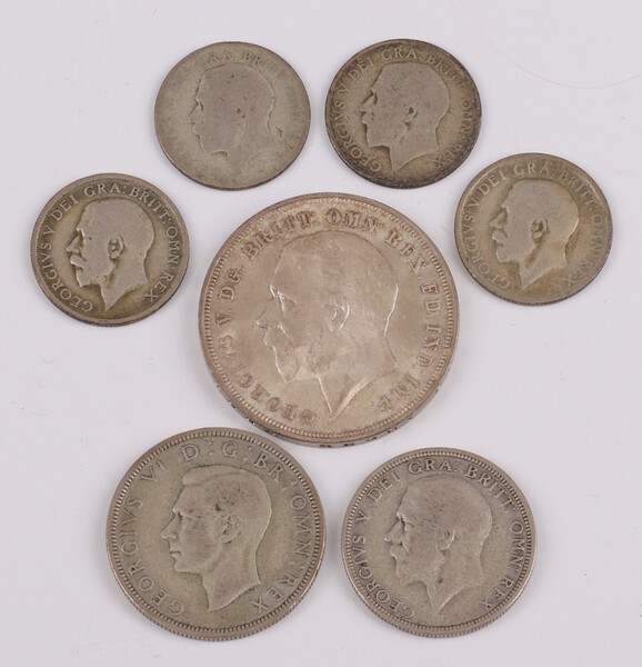 Lot 309 A George V 1935 silver crown together with a small quantity of George V and George VI pre-1947 silver coinage, total weight 74.5 grams £50-70