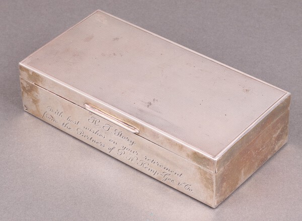 Lot 313 A rectangular silver cigarette box with engine turned decoration and inscription "H J Story with best wishes on your retirement from Partners of R N Kemp - G & Co." Birmingham 1970 4cm h x 17cm w x 9cm d £70-90