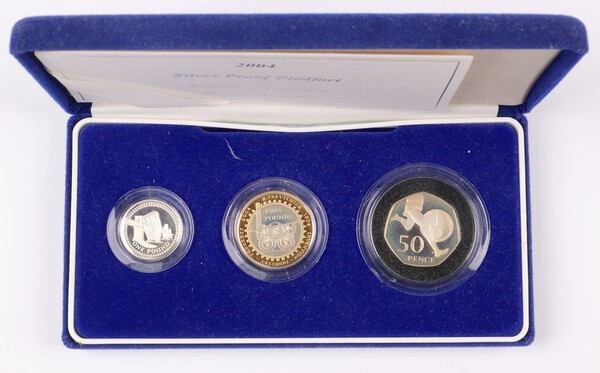 Lot 313 A 2004 Silver Proof Piedfordt coin set containing a sealed one pound, two pounds and a 50p in a fitted case £60-80