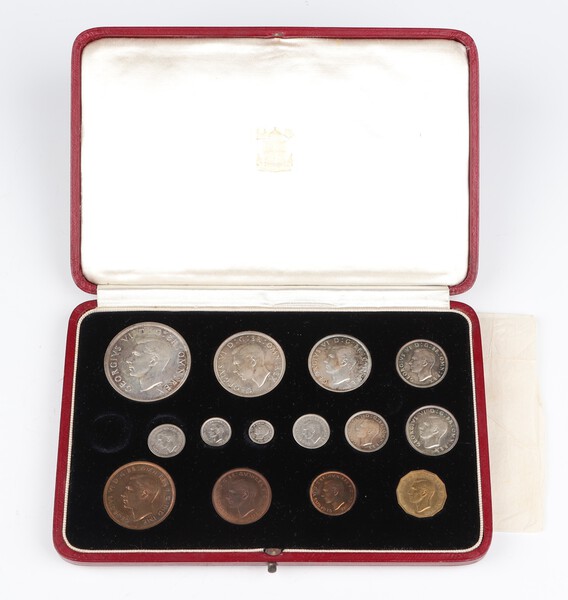Lot 314 A set of 1937 George VI specimen coins, in original fitted red leather and gilt case with royal cypher, gilt lettering £150-200