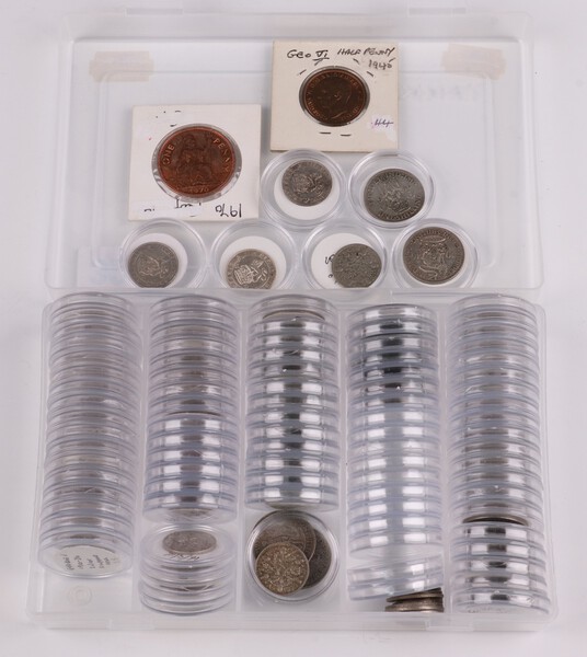 A collection of individually cased sixpences, approximately 50 are pre-1947 with the others being post 47 and other uncased minor silver coinage
