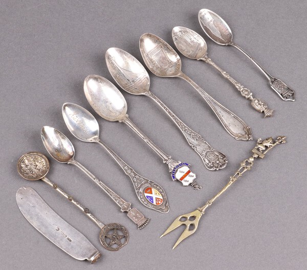 Lot 324 A silver fruit knife blade, a silver and enamelled souvenir spoon and a quantity of Continental souvenir spoons £30-40