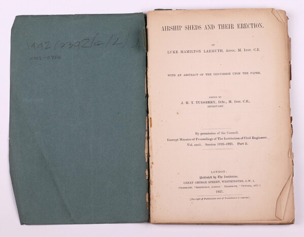 LARMUTH, Luke Hamilton, Airships Sheds and Their Erection. London: Clowers and Sons 1921. 12mo, 61pp. Paper bound, diagrams throughout and 4 large fold out plates. Covers loose with sellotape repairs, pages toned in places. Initialled B.N.W to endpaper