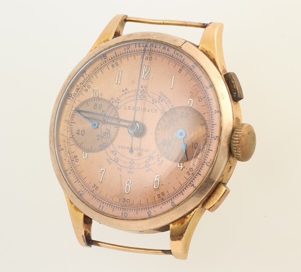 A gentleman's Lebois & Company Anti-magnetique chronograph wristwatch with champagne dial, Arabic numerals, 2 subsidiary dials (missing second hand), the movement signed Lebois & Co., contained in an 18ct Swiss gold case, marked 18k 0750 numbered 25977, gross weight 33.2 grams including movement and glass but excluding dust cover