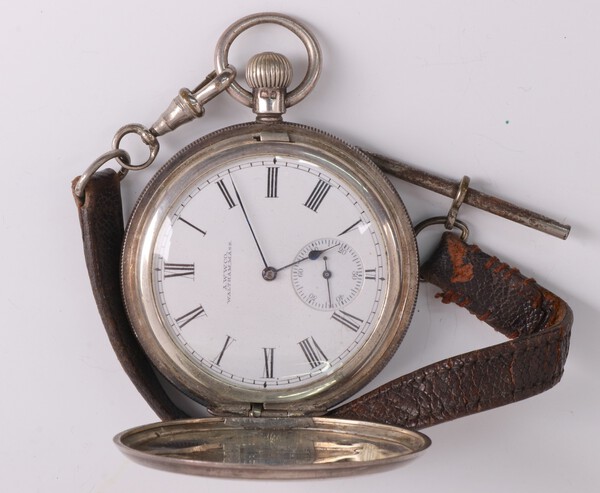 Lot 365 A Waltham full hunter keyless pocket watch with enamelled dial, Roman numerals, seconds at 6 o'clock, the dial signed American Waltham USA Envor, contained in a silver case £40-50
