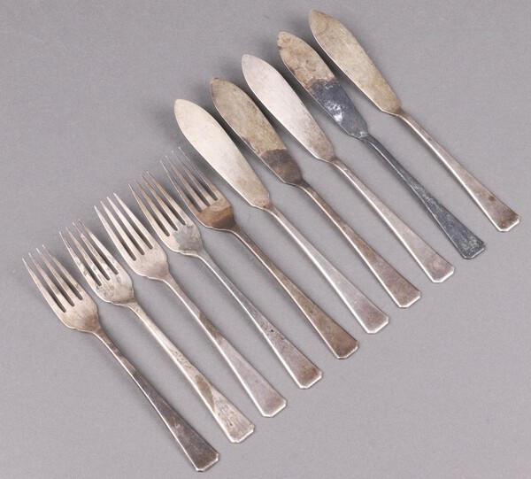 Lot 371 A set of 5 Art Deco silver fish knives and 5 forks for Harrods Ltd, London 1935 with Jubilee hallmark 454g £280-340