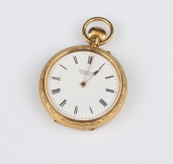 Lot 378 An 18ct yellow gold cased, keyless, open faced pocket watch by Russells of 118 Church Street Liverpool, the back signed and numbered 255924, 47.4 grams gross £300-400