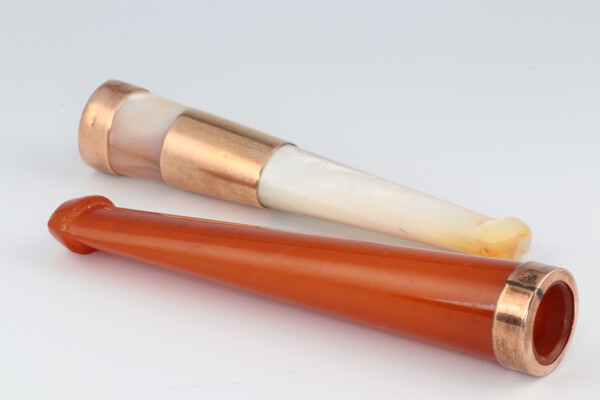 Lot 38 An "amber" cigar holder with 9ct yellow gold mount 6cm and a mother of pearl ditto 6.5cm £50-75