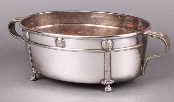 Lot 386 Viners, an oval silver plated Gothic Revival twin handled bowl with roundel decoration, raised on paw supports 10cm h x 29cm x 17cm d £30-40