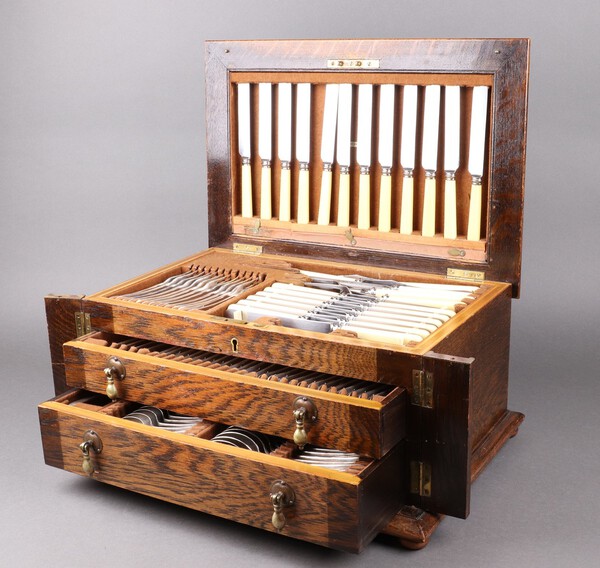 A 106 piece canteen of silver plated Old English pattern flatware comprising gravy spoon, soup ladle, pair of sauce ladles, pair of knife rests, sugar tongs, 11 tea spoons, 12 soup spoons, 4 table spoons, 12 table forks, 12 dessert spoons, 6 egg spoons, 12 dessert forks, 12 table knives, game carver, meat carver, steel, game fork, meat serving fork, all contained in an oak canteen box with hinged lid, fitted 2 drawers  £100-150