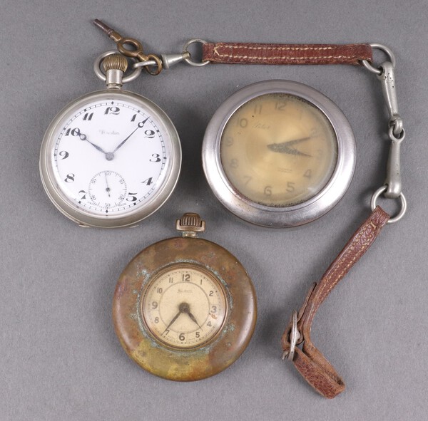 Lot 390 A Nestou open faced pocket watch with enamelled dial, Arabic numerals, contained in a chrome case, a Pilot dress pocket watch contained in a chrome case (glass loose) and a gilt cased pocket watch £30-40