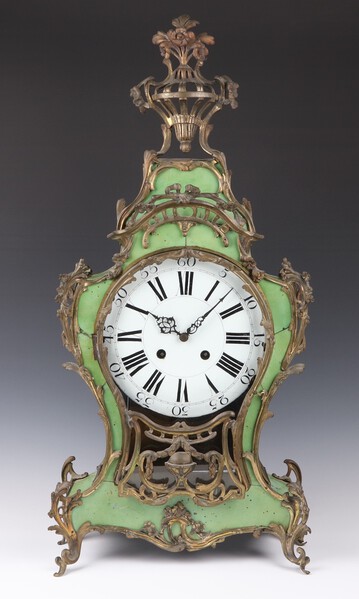A large and impressive 18th Century Swiss Neuchatel striking clock with 25cm enamelled dial, Roman numerals, contained in a green tortoiseshell effect case with heavy gilt ormolu mounts, raised on panelled supports, surmounted by a pierced urn 88cm h x 40cm w x 17cm d, complete with pendulum but no key