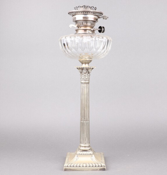 Lot 396 A cut glass and silver plated oil lamp, raised a silver plated column with Corinthian column capital and cut glass reservoir 42cm £50-75