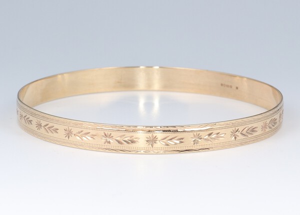 A 9ct yellow engraved gold bangle, 7cm diam., 11 grams