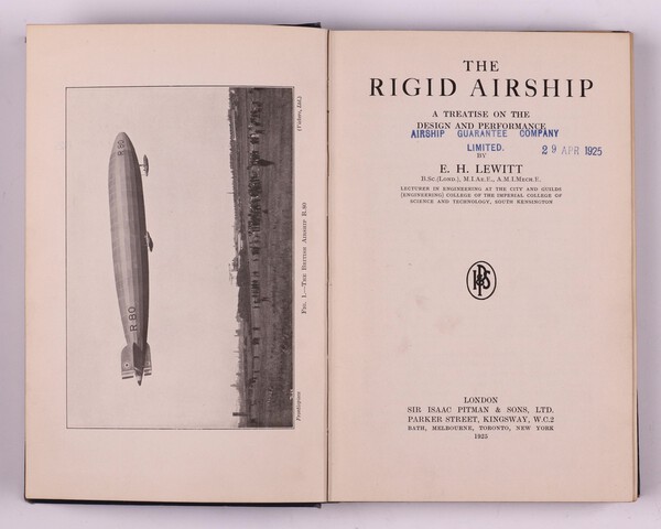 LEWITT, E. H. The Rigid Airship - A Treatise on The Design and Performance. London: Sir Isaac Pitman & Sons Ltd. 1925. 8vo, 283pp. Original blue cloth, gilt lettered spine. Fading to spine, rubbing to corners and edges of spine. Signed B.N. Wallis
