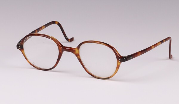 A pair of Sir Barnes Wallis circular tortoiseshell effect framed glasses circa 1940/50s, Wallis can be seen wearing these glasses in a promotional photo for "The Dam Busters" 1955 film alongside Michael Redgrave (one lens is loose).