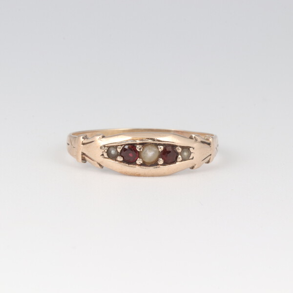 A gold testing as 9ct ruby and pearl set ring, size N 1/2, 1.7g