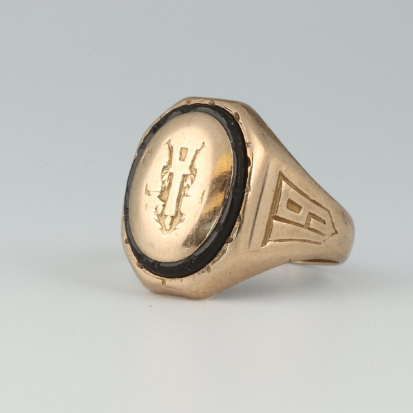 Lot 44 An American gold "college" ring marked 10K Jenkins Baltimore, the shoulders dated 1934, 6.8 grams gross £150-200