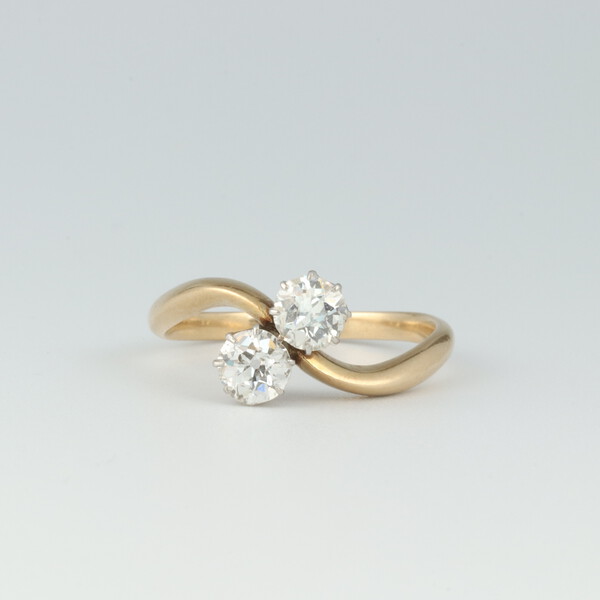Lot 45 A gold testing as 18ct, 2 stone old cut diamond cross over ring, approx. 0.25ct, size N, 3.2 grams £100-150
