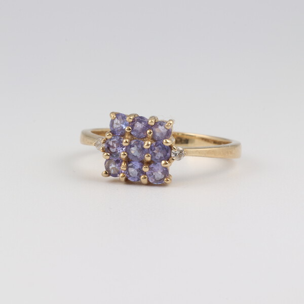 A 9ct yellow gold square amethyst set cluster ring, size N, 2.3 grams
