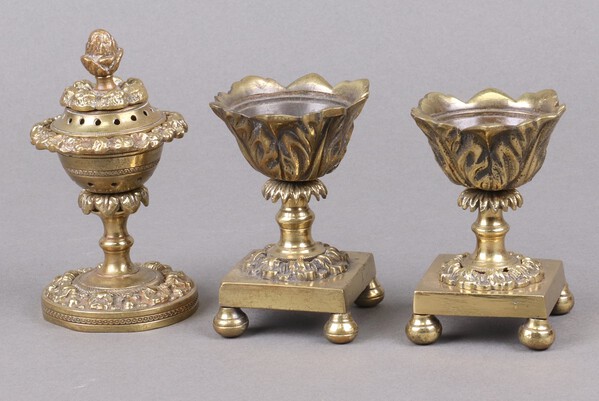 Lot 466 A Regency pierced gilt metal circular pot pourri and cover on a circular spreading base, together with a pair of flowers head ditto raised on square bases with bun feet 11cm (both missing lids) £30-50
