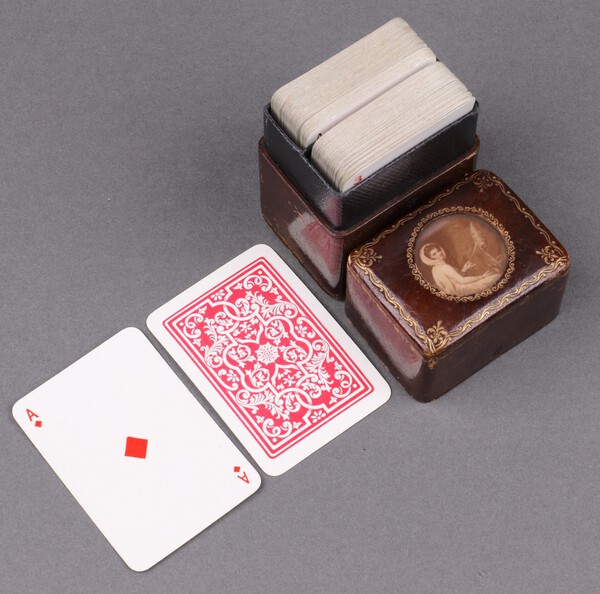 Lot 469 Two sets of playing cards contained in a leather finished box with tooled gilt decoration 8cm x 5cm x 4cm £30-40