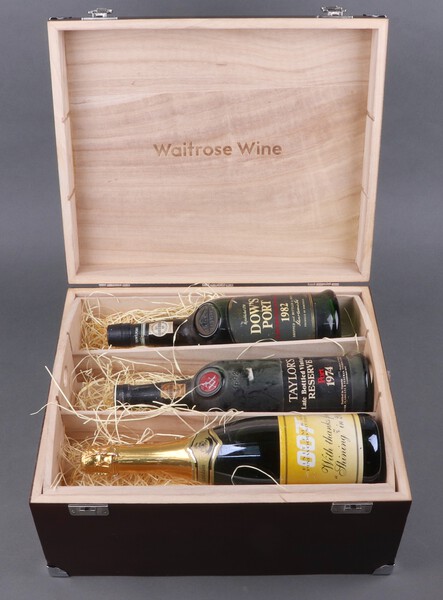 A bottle of 1974 Taylors late bottled vintage port, a bottle of Dow's 1982 late bottled vintage port, a bottle of Paul Chamblain OO7 FM and HR Pinewood Studios sparkling wine marked "With thanks for joining in 2000" all contained in a Waitrose wine box
