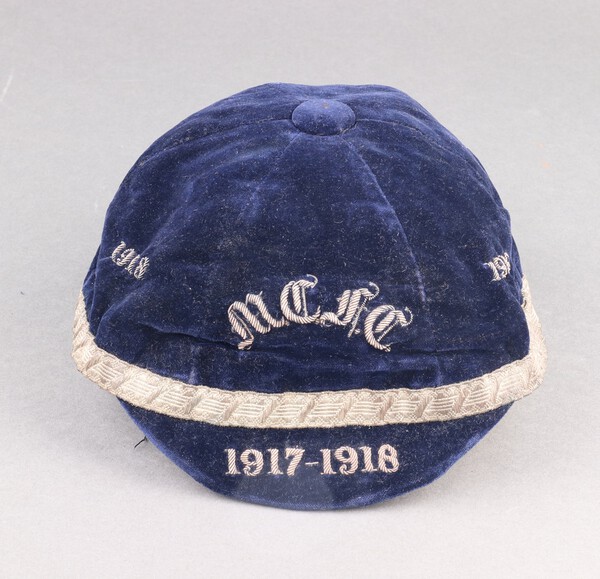 Two early 20th Century Rugby / Football caps in blue cloth with gilt braiding, one the crown with braided lettering "1918 M.C.F.C 1919" (possibly Manchester City Football Club), the brim lettered "1917 - 1918", the other in blue cloth with gilt braiding, the crown with braided lettering "1918 1919", divided by a gilt logo of a Saltire beneath a Crescent, the brim lettered "1918-1918", both with label to interior "Aitken and Niven, 40 Queensbury St, Edinburgh"