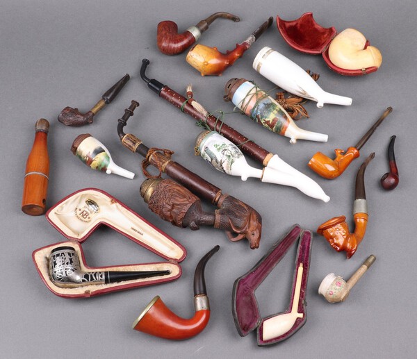 Lot 471 A Medico Sterling silver mounted pipe, a Calabash pipe, a Meerschaum pipe with plated mount, a Peterson's System Standard pipe, a Meerschaum pipe bowl in a leather case, 8 other pipes and 3 porcelain pipe bowls £40-60