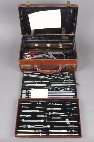 A comprehensive professional draughtsman's set with compasses, pencils, rules, contained in 3 trays and within a leather case, within the base there is the remnants of a decayed rubber, together with a business card for AAD Brown, Chief Spring Designer for Salters Scales, some pieces with ivory handles. With non-transferable standard ivory exemption declaration number GRQ4AURB