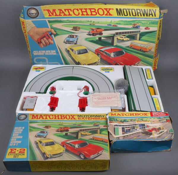 Lot 494 A Matchbox M-2 motorway boxed (tears to the box), ditto E2 motorway extension boxed and a Service Station boxed (box damaged) £50-75