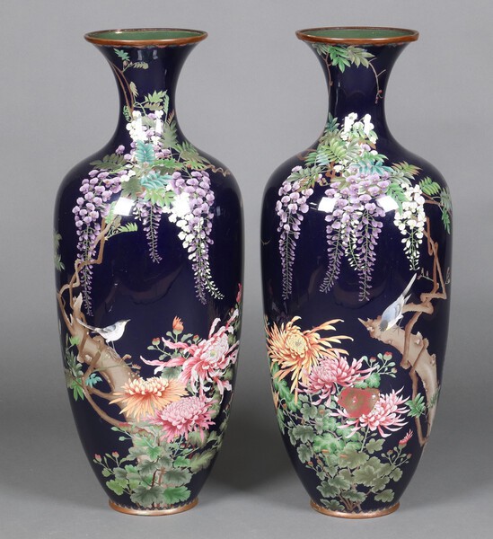 Lot 502 An impressive pair of 19th Century Japanese black ground and floral patterned cloisonne enamelled vases decorated birds amidst branches 85cm £80-120