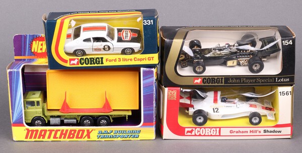 Lot 505 A collection of 1970's boxed vehicles to include Corgi Ford 3l Capri 331, Corgi John Player Special Lotus 154, Matchbox Super Kings K-13 transporter and a Corgi Graham Hill Shadow 1561 £30-40