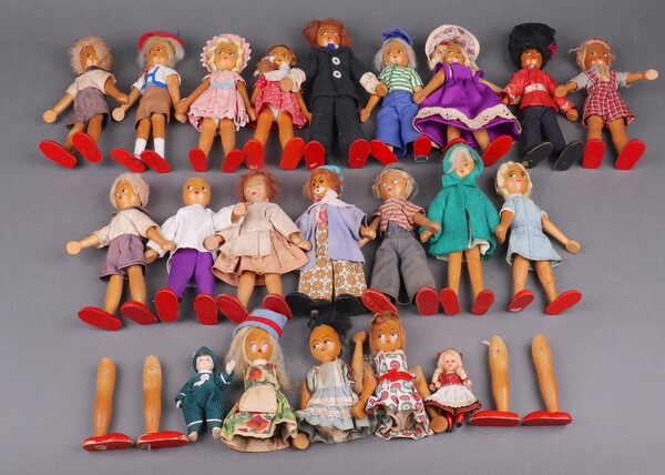 Lot 508 A collection of 12 mid-century Polish peg dolls in various costumes together with 5 smaller examples £40-50