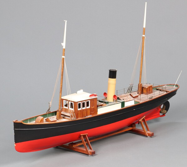 Lot 509 A mid-century wooden electric model pond steamer raised on supports 15cm h (including mast 67cm high) x 120cm long x 21cm wide £50-75