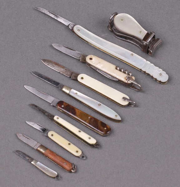 A 2 bladed folding pocket knife with corkscrew marked Made in Germany, with mother of pearl effect grip, a folding knife the blade marked HBA with tortoiseshell effect grip 4cm, 1 other with B Company mark and mother of pearl grip 7cm, 6 folding knives and a pair of toenail cutters with mother of pearl mount