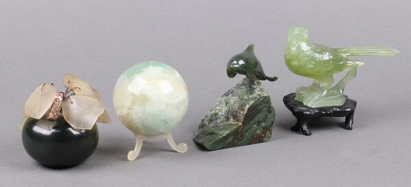 Lot 524 A polished green hardstone sphere 5cm, a carved hardstone figure of a wave with dolphin 5cm, a carved hardstone figure of fruit 5cm and ditto bird £40-60