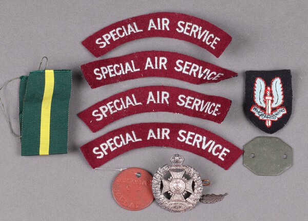 Lot 525 Four Special Air Service cloth shoulder titles, a Special Air Service copper beret badge, an Officer's Rifle Brigade Cap Badge, 2 dog tags marked 162702A2 J L Clay, a TD ribbon and a MID oak leaf £50-75