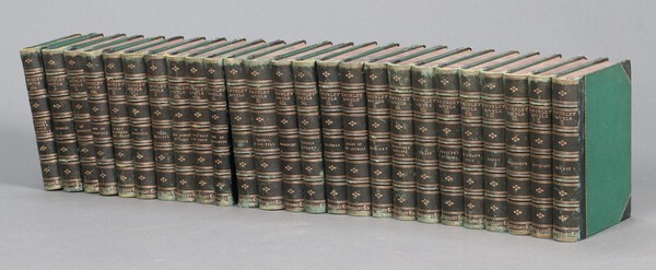 Lot 530 The Waverley Novels Centenary Edition, Edinburgh Black 1871, 26 volumes, quarter bound in Morocco gilt and cloth, the spines with raised bands and gilt lettering £30-40