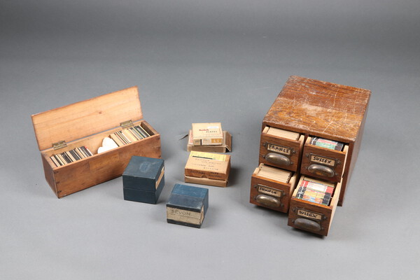 Lot 539 A large collection of 1920's and 30's photographic slides depicting landscapes of France, Sussex/Surrey and Devon together with boxes of unused plates, a quantity of slides contained in a 4 drawer index card filing cabinet £50-75