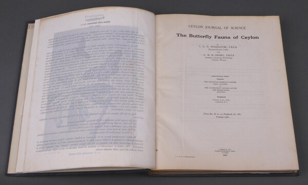 Woodhouse, L G O and Henry, G M R, "The Butterfly Fauna of Ceylon (Sri Lanka)", Ceylon Government Press Colombo 1942, First Edition Presentation Copy number 115 (stamped to paste down), bound in original blue cloth and gilt, tissue guarded plates throughout, 4to., incomplete typed receipt document from the Surveyor General's office in Colombo within
