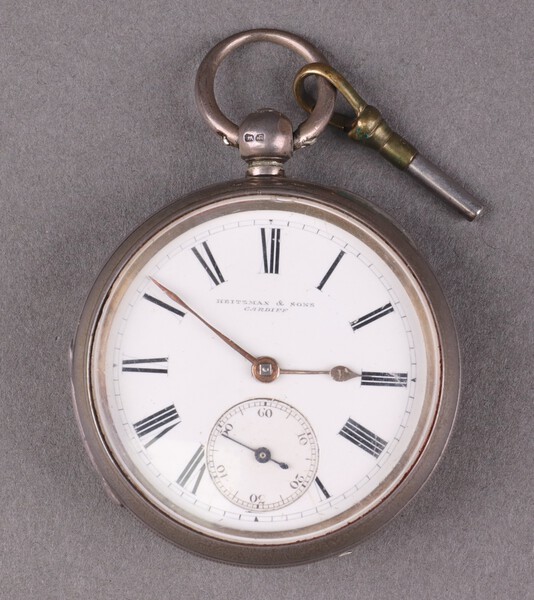 Heitzman and Sons Cardiff, an open faced pocket watch with enamelled dial, Roman numerals and subsidiary second hand, the dial and back plate signed, no.816560, contained in a silver case Birmingham 1838  £50-75