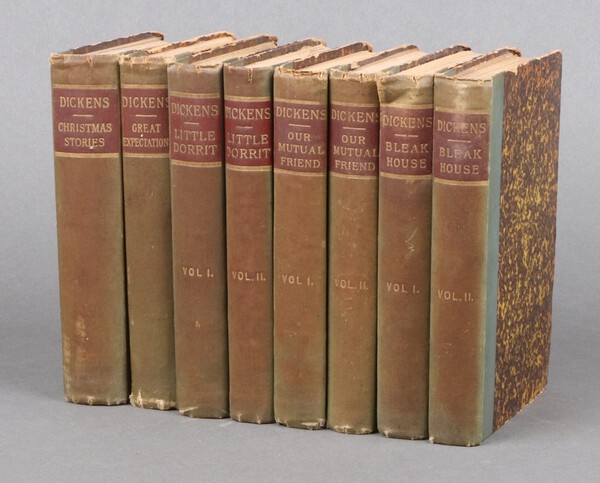 Dickens, Charles, a collection of 5 works in 8 volumes, Richard Clay and Son London (late 19th early 20th Century), quarter bound in green cloth and marbled paper, 12 mo., to include Christmas Stories, Great Expectations, Little Dorrit, Our Mutual Friends and Bleak House