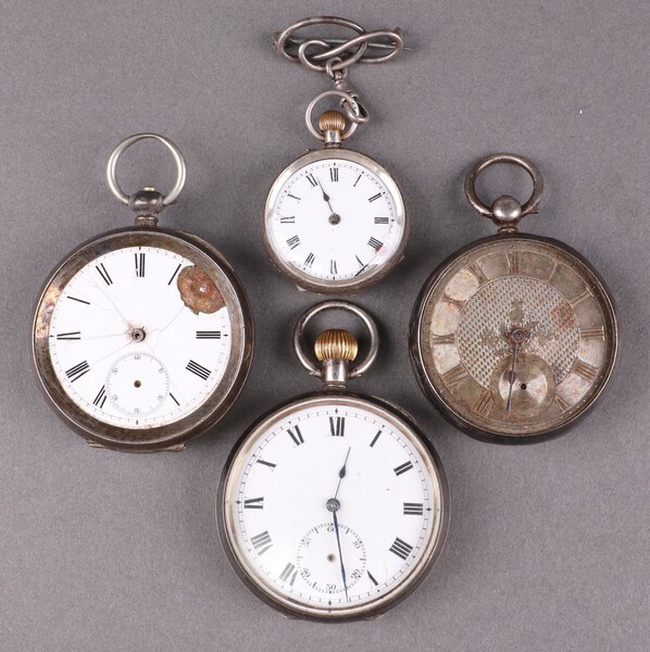Robinson of Chesterfield, an open faced pocket watch with silvered dial, gilt Roman numerals and subsidiary second hand (second hand missing), movement no.7786 contained in a silver case London 1859 (glass missing, watch currently not running), together with an open faced pocket watch the back plate marked E & M Iguldson Edinburgh (not running, large chip to dial, glass missing), a Tacy Watch Company Mysteria keyless pocket watch contained a 925 case (subsidiary second hand missing and not running) and an open faced pocket watch
