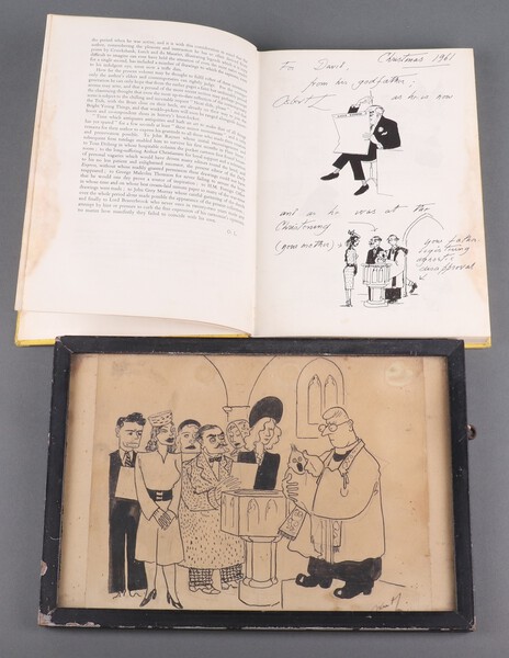 **Lancaster, Sir Osbert (British 1908-1986), a framed pen and ink cartoon of a Christening (17cm h x 25.5cm w) together with a cartoon as dedication to a volume of Lancaster's works depicting Lancaster reading a newspaper and a baptism "For David from his Godfather Osbert L as he is now and as he was at the Christening" dated Christmas 1961 **Please note - Artists Resale Rights may be payable on this lot