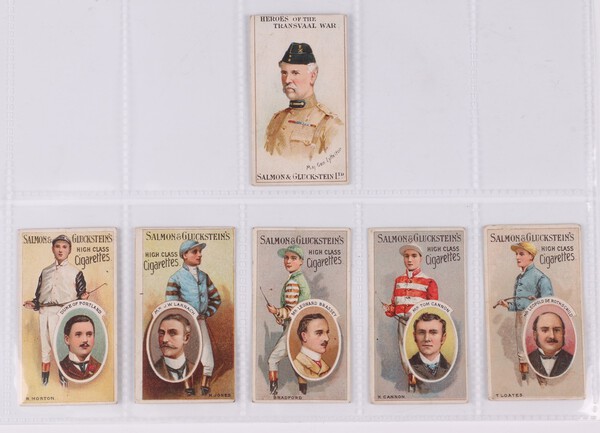 Cigarette cards, Salmon and Glucksteins Owners and Jockey Series, a set of 5 (Duke of Portland, Mr J W Larnach, Mr Leonard Brassey, Mr Tom Cannon and Mr Leopold De Rothschild) together with a single Heroes of The Transvaal War - Major General Lyttelton