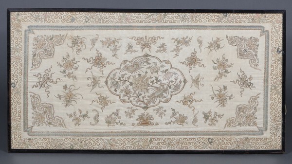 Lot 556 A 19th Century pink bullion embroidered floral patterned panel 48cm h x 96cm w, with central medallion decorated butterflies and flowers £40-60